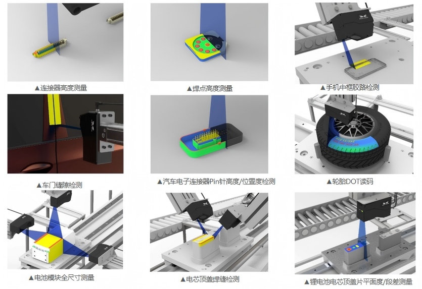 3D应用场景:1.典型行业(3C、新能源锂电、汽车、 半导体等) 2.典型场景(3C零部件(如:手机中框、 屏蔽罩、连接器Pin针等)、 锂电池组件(如:电芯顶 盖片、密封钉等)、汽车 零部件(如:防撞梁、电 池托盘等)关键特征(高 度、尺寸、平面度、轮廓 度等)高精度检测 / 量测)