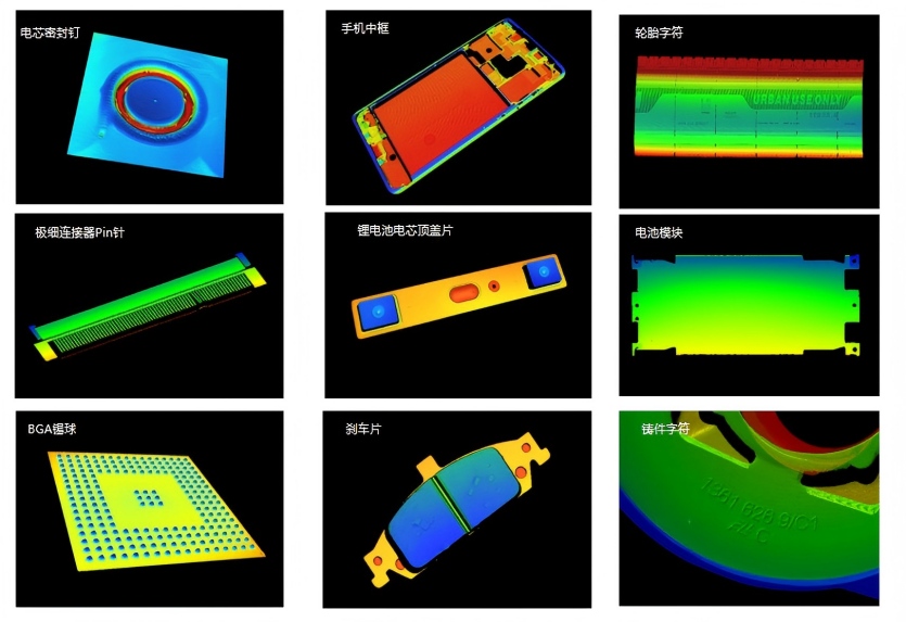 物体3D点云图:4K超高分辨率,可 为每条轮廓提供 4096个数据点,有 效应对物体表面细 微的凹陷、突起等 情况,细致、精确、 完整地呈现物体真 实轮廓。(电芯密封钉,手机中框,轮胎字符,极细链接器pin针,锂电池电芯顶盖片,电池模组,BGA锡球,刹车片,铸件字符。)