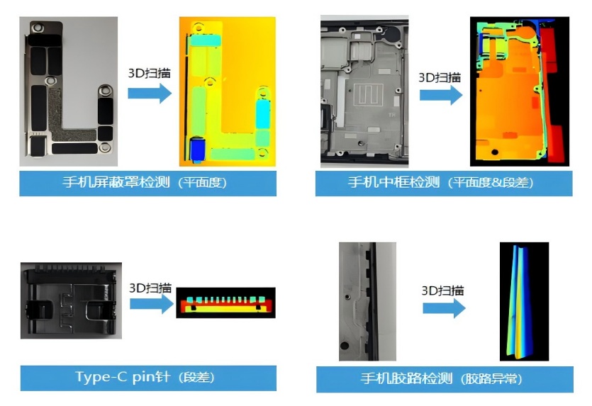 3D项目背景(• 零件种类多,尺寸大小各不相同。 • 零件跨行广,涉及五金、SMT、电池等细分行业。 • 检测精度高(≤0.01mm),检测速度快(350mm/s), 项目优势:• 梅卡曼德Mech-Eye3D线激光轮廓测量仪和软件RTVision配套 实施,可调用2D图像及3D图结合Vision各种算法集成,让调 试、维护和操作更加便利。 • 检测速度快:UPH≥2400Pcs,精度高:动静态重复精度 ≤0.01mm。 • 产品3D图形扫描展示,让检测部位可视化且更加清晰,让品质 管控方向更加明确,协助产品工艺分析。